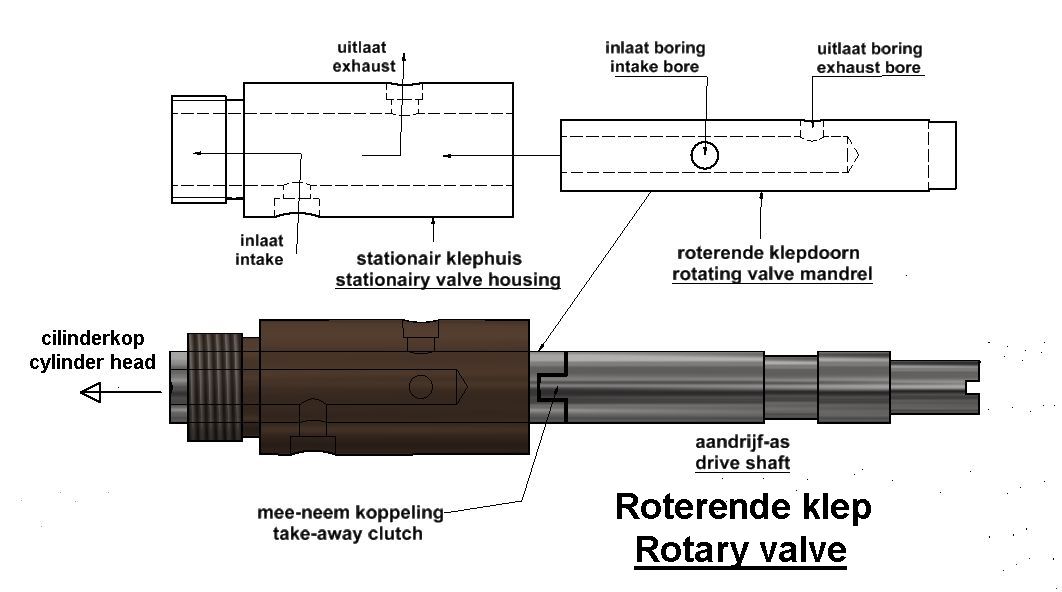 Adjusting the engine is extremely simple. It comes down to having the start of the intake coincide exactly with the (first) highest position of the piston. If this is set this way once, the other process settings are automatically correct because they implicitly follow from the relative geometries of the bores in the rotary valve. Setting this intake moment is done as follows: