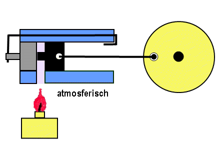 A little before the piston reaches the flame hole again the cooled flame gasses are compressed to atmospheric pressure causing the slide valve to open the flame hole just enough to let the flame gasses escape to the outside atmosphere. This construction thus automatically ensures that there can not occur a counter-acting overpressure in the cylinder. When the piston moves further in the direction of the flame hole it pushes the sliding valve all the way to its extreme position whereby the flame hole is entirely opened again and the process repeats itself because of the flywheel effect. The animation below illustrates this unique process: