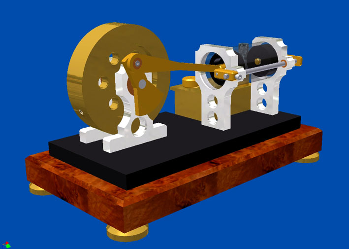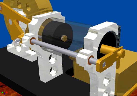 The picture above shows the valve pusher which is a 3mm steel shaft that can slide in two bronze bushes in the two aluminum cylinder supports. On one side a driver for the slide valve is soldered. On the other side there is a stop pin which is screwed on to this shaft. Shortly before the piston is in its extreme back position it touches this stop pin, pushing the slide valve over the flame hole. At that time, the flame gases are trapped in the cylinder and cool down against the wall which creates a partial vacuum in the cylinder. The excess pressure of the outside air drives the piston in the flame hole direction which provide the engine work power.