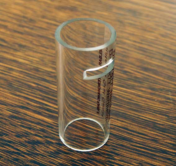 The nicely sawing at right angles, and especially the making of the flame hole in the cylinder wall is a rather special trick. Partly due to the relatively thick wall, this is only well to do with a diamond grinding disc in e.g. the Dremel rotary tool. I myself made for this kind of work a special but simple arrangement with what I do this job easy and perfect; see the relevant page on this web site. Somewhat to my pleasant surprise it shows that the mechanical strength of this borate silicate glass at the location of the flame hole is not to be affected by the grinding work at all. More importantly in this case was that it also withstand the hot flames of the alcohol burner near the flame hole and this was of course a precondition for the use of a glass cylinder for a flame-eater.