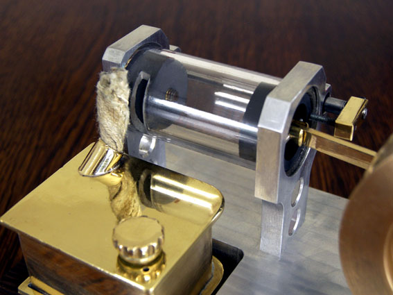 This flame-eater starts immediately after a slight manual push to the flywheel. During the first minutes, there is some visible water condensing in the cylinder, but this disappears as soon as the cylinder which is warmed up a little. Thereafter, the engine is running flawlessly with a genteel pace of 400 to 500 RPM. The speed is mainly limited by the fact that the piston and the slide valve continuously make mechanical contact which is clearly audible with fairly prominent tapping sounds. I personally like this " tough" behaviour of this still very small model. There is no preference for the direction of rotation.