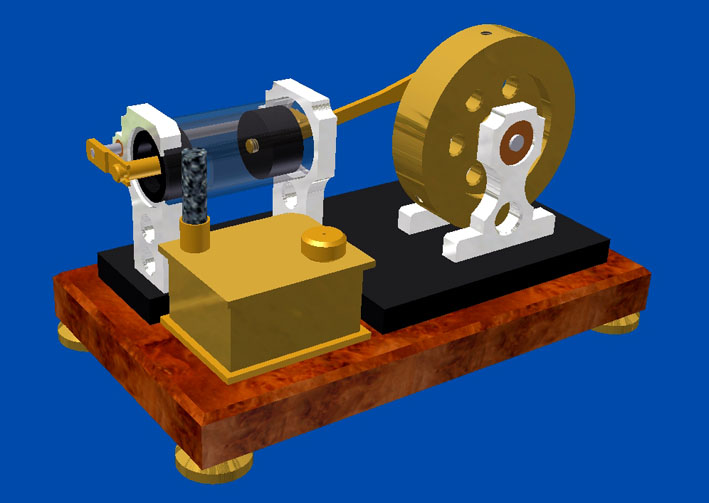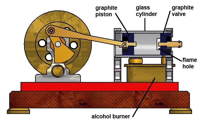 Introduction. Recent years I have designed and made several flame-eaters, see the respective overview.Fore sure flame-eaters are attractive models for model builders because they are relatively easy to make with little and well manufacturable parts. However, flame-eaters suffer almost without exception to a common drawback: internal corrosion (rust) that is caused by the sucked-in hot and humid flame gases in the cylinder at each cycle. The result is an increase in friction between the piston and the cylinder wall through which the motor gradually get slower to run and finally even will not start at all. Depending on the materials applied for the cylinder and the piston one must clean the cylinder bore and the piston more or less frequently for what the engine must be partially dismantled. Except that this is a nuisance it causes sometimes an inadmissible clearance between the piston and the cylinder bore due to the repeatedly removal of the corrosion layer. In particular, small flame-eaters have a comparatively low power so that this corrosion relatively quickly leads to a not running engine. I wanted to settle once and for all with this problem where I realized that this was only possible only by using materials for the piston and the cylinder that does not corrode at all under these conditions. Supported by my good experiences with glass cylinders and graphite pistons for internal combustion engines ( see eg. 1-Cylinder 4-stroke, 2-cylinder 4-stroke and Hybrid 2- 4-stroke) I conceived the idea to design a flame-eater with a glass cylinder with a piston and an internal valve therein, both made from graphite. Glass and graphite don't corrode under these circumstances and the self-lubricating graphite piston continues to run virtually frictionless in a super sleek glass cylinder without any lubrication if it is made nicely fit in it. This self-lubricating property of graphite is also an important advantage because lubrication with oil is not advisable with flame-eaters because that oil will burn quickly in the cylinder, leaving residues against the cylinder wall and the piston with fatal frictions as a result.