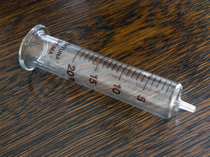 1.De glass cylinder. As I did before with some of my IC engines I cut the cylinder from a glass syringe, type "Fortuna Optima 20ml"; fabricated by POULTEN & Graf, Germany, see picture below: