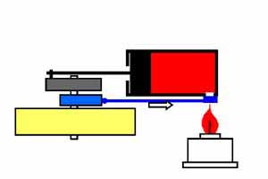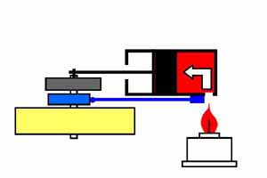 De zuiger beweegt naar links. Deze beweging wordt veroorzaakt door het vliegwiel-effect. Het schuifje blijft gedurende deze beweging van de zuiger in de linker positie staan, waardoor de hete vlamgassen door de opening in de cilinder gezogen worden. |