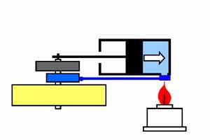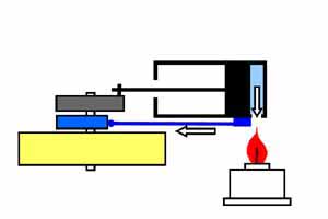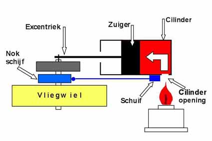 zuiger is uiterst rechts aangekomen. Ca 40º voor deze positie heeft het schuifje de opening in de cilinder weer vrijgegeven, waardoor de afgekoelde vlamgassen naar buiten zijn gedreven. Het vliegwiel zorgt ervoor dat de beweging doorgaat en de cyclus zich zodoende herhaalt. |