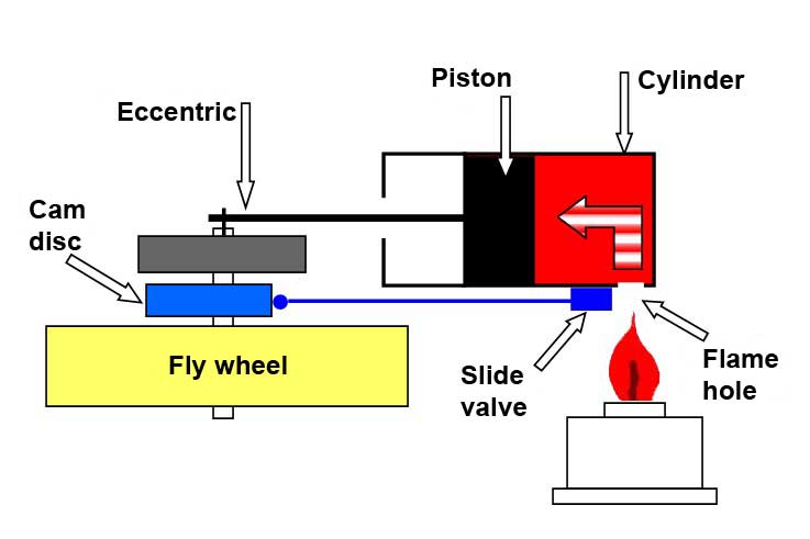 1. The piston moves to the left. This movement is caused by the flywheel effect. The slide valve is stationary in the left position during this movement of the piston, so the hot flame gases are drawn in the cylinder through the flame hole. |
