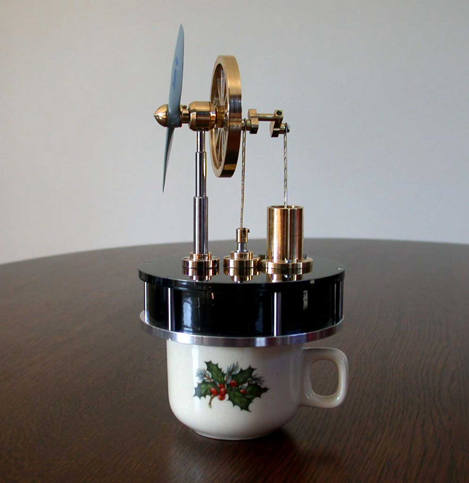 The Coffee Cup Stirling is a very simple engine but surely not inferior at all. On the contrary, it is one of the best "instruments" to demonstrate the Stirling principle. You only need a cup with hot coffee or water to let it run; no flames, no steam, no explosions, no smell, no noise, no danger. The only engine you can demonstrate while drinking coffee with your friends in your living room. Success always guaranteed even for non technical orientated spectators. And even with some fantasy and good will you can give it an eye-catching appearance and let them look like a small ornament.