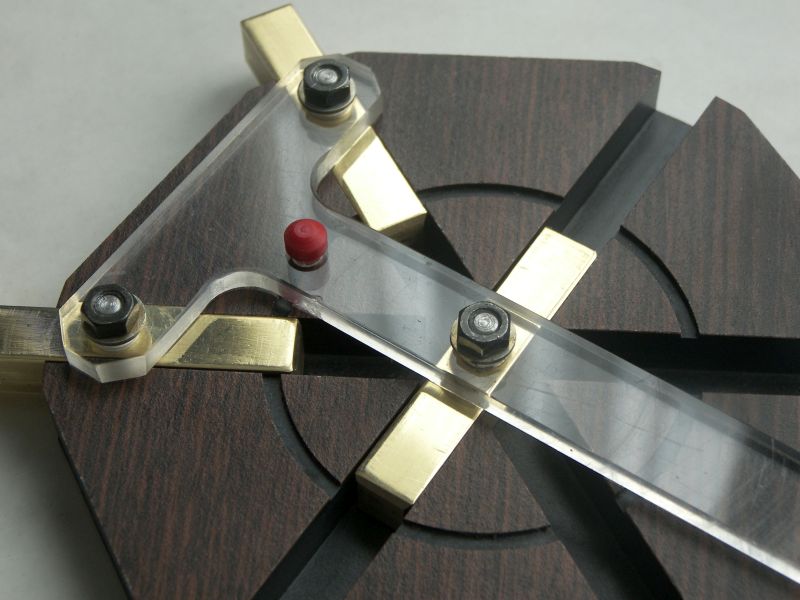 I also made a red plastic pimple on the swivel arm at the only place where a pure circle is described, namely at the intersection of the three heights of this equilateral triangle, in other words the center of gravity of the triangle. According to my son-in-law Maarten (who is also a mathematical phenomenon) that is because the distances from that pimple to the three vertices of the triangle are exactly the same there. He says that a circle is actually a special ellipse in the sense that it only has one radius, it's just how you look at it.