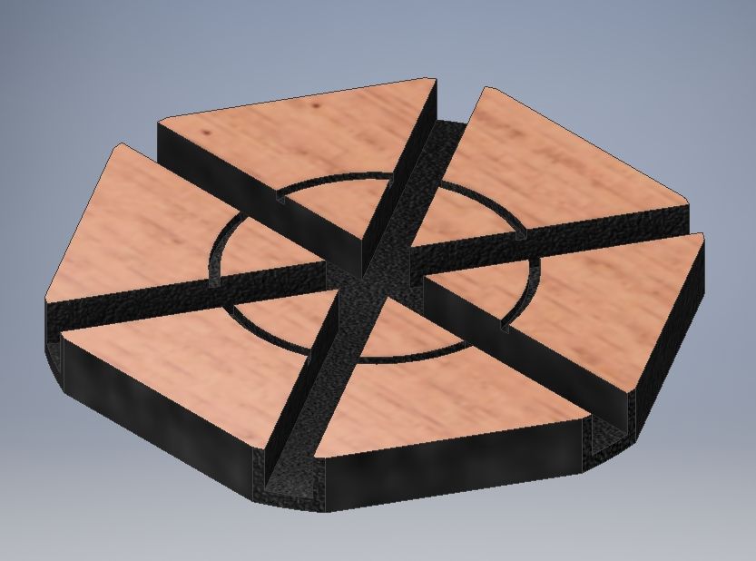 1. A plate with 6 milled slots in it at 60 degrees, 9 mm deep and 9 mm wide. For that I used a 12 mm thick Trespa plate with a wood structure as a finish: