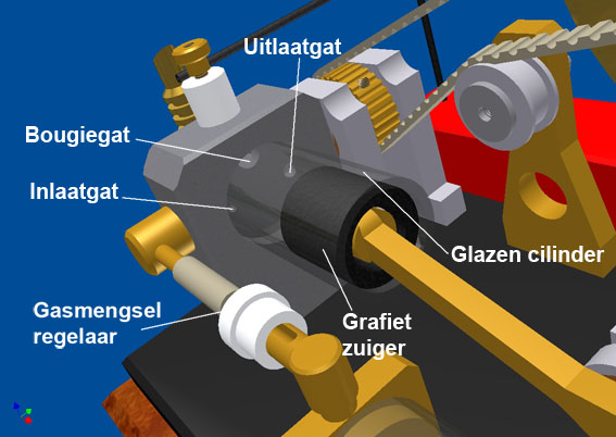 Alternatief voor de glazen cilinder In het (niet onwaarschijnlijke) geval men niet aan dit zeer speciale glas en/of het grafiet voor de zuiger kan komen is het ook mogelijk om de cilinder en de zuiger van bv. perlietich gietijzer (GG25) te maken. Als die beiden goed gemaakt worden (vrijwel lekvrije passing met lage wrijving) zal de motor daar vrij zeker ook goed mee lopen.