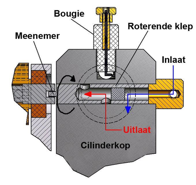 - Een uiterst simpele roterende klep in de cilinderkop in plaats van twee op en neer gaande kleppen met het nokken aandrijf systeem;