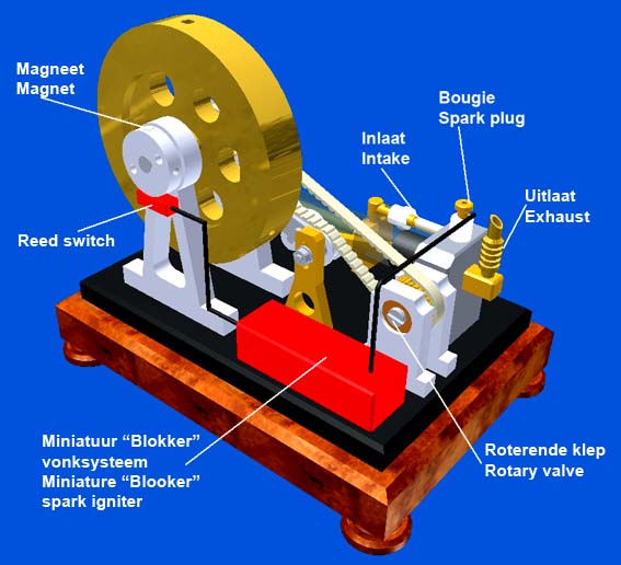 For the spark ignition I again used the customized miniature circuit from the "Blokker" gas lighter, see the concerning page. A neodymium magnet in the aluminium start-up pulley runs along a reed switch that controls the sparks at the right moments in the process.