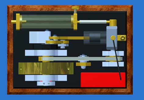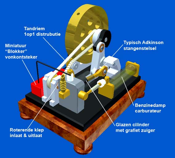 1. The Atkinson principle. Typical for the Atkinson is that the four piston strokes (intake, compression, power and exhaust) are made with only one revolution of the flywheel, other than the 2 revolutions turns with the normal (Otto) 4-stroke. The distribution between the crankshaft and the valve system is therefore 1 to 1 instead of 2 to 1. An important feature is also that the exhaust stroke is greater than the other three strokes. This makes it possible to drive the piston at the end of the exhaust stroke by a hair thickness against the cylinder head so virtually all the burnt gases are driven out of the cylinder. In the normal 4-stroke the distance of the piston to the cylinder head is, by definition, equal to the distance at the moment of maximum compression. Since I prefer to work with fairly low compression for easy starting and a quiet running behaviour this volume of the combustion chamber at a normal 4-stroke is still about 20% of the cylinder volume so with a normal 4-stroke this percentage of the burned gasses remains in behind the cylinder at the moment the fresh gas mixture from the carburettor is sucked-in again. With industrial 4-stroke engines, there are various techniques for reducing the impact of this dead space, but this is difficult to achieve for simple IC models . As a result the cylinder charge in the Atkinson cylinder is much more pure, which will result in a more efficient combustion. In fact the efficiency is not that important for small model engines, but a better combustion of the purer gas mixture will contribute to a more reliable running behavor for sure. An important disadvantage of the Atkinson is the rather complex driving system with quite abrupt reverse movements, causing a more violent running behaviour. Apart from the fact that it is hard to make this system compact the balancing of it is extremely difficult. As far as I know, this is the most important reason why the Atkinson principle in the industrial practice has lost it from Otto principle, while both systems are almost simultaneously designed in the second half of the 19th century. However, for a model engine this disadvantage is no real objection; it is exciting to see how this Atkinson driving system makes these typical piston movements.