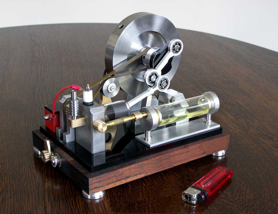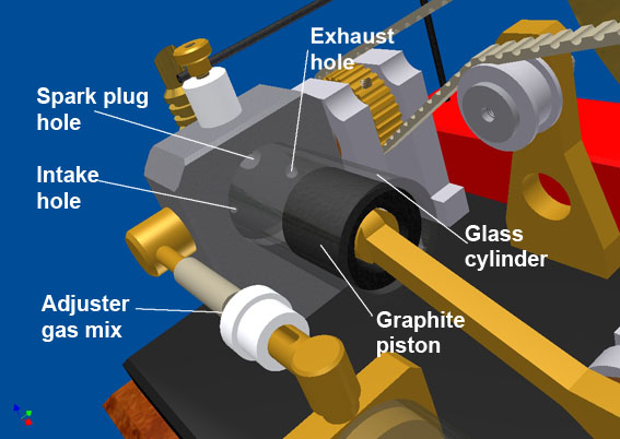 This more compact Atkinson is running a lot less boisterous than its predecessors, mainly because this continuously rotating valve will not cause any shock loads as conventional poppet valve systems with cam discs, pushers and rockers do. The very low friction of the graphite piston in the glass cylinder (without any lubrication!) also contributes to a smoother running behaviour. Another advantage is the much simpler overall construction.
